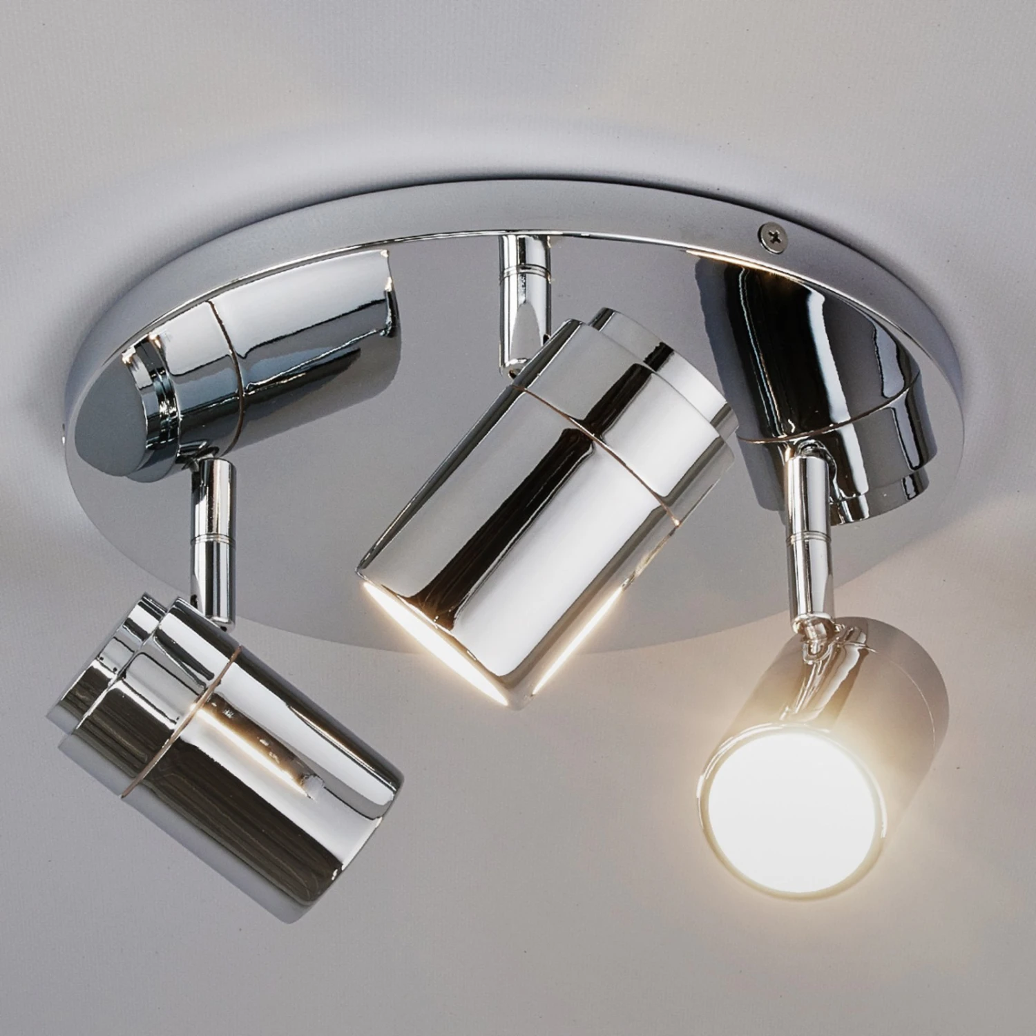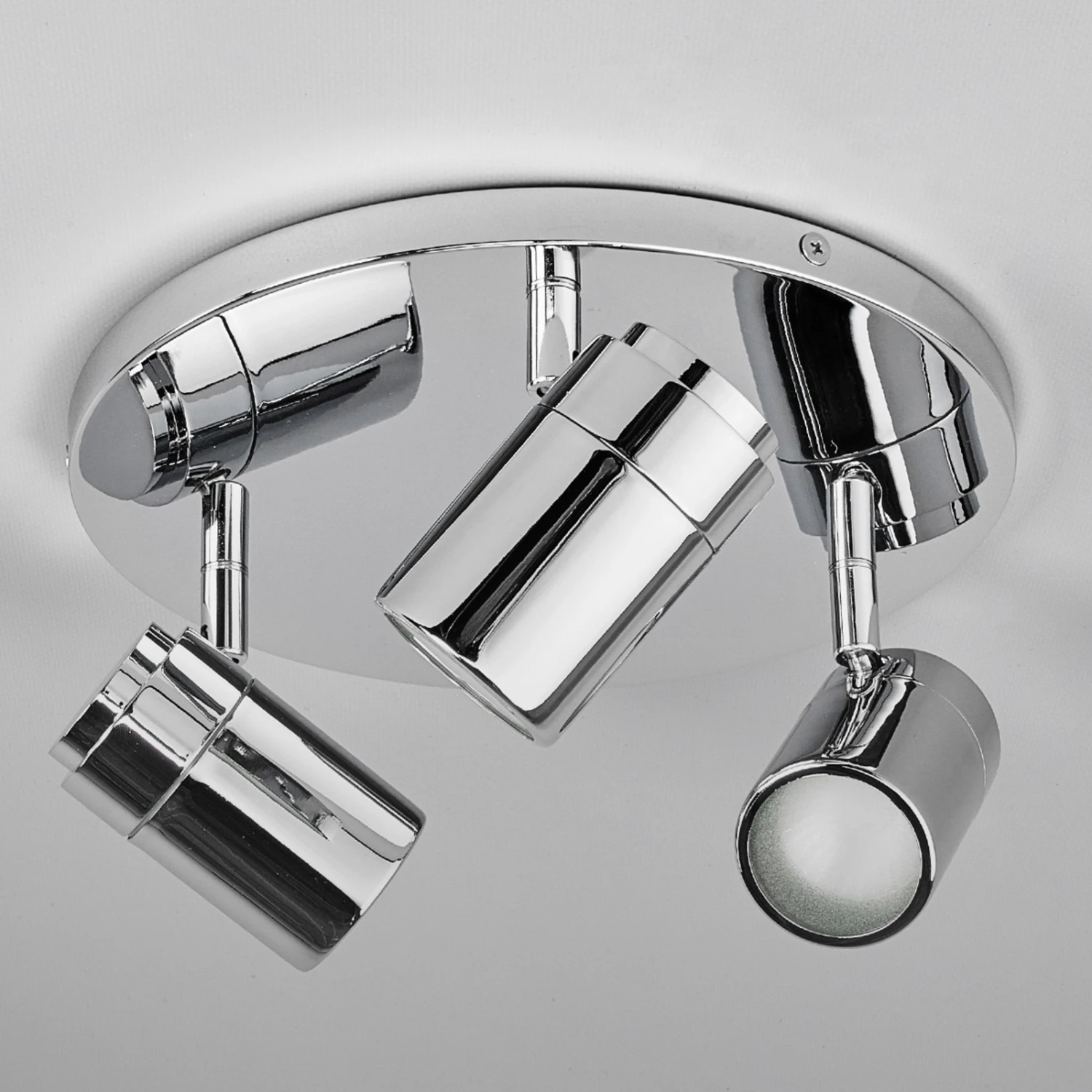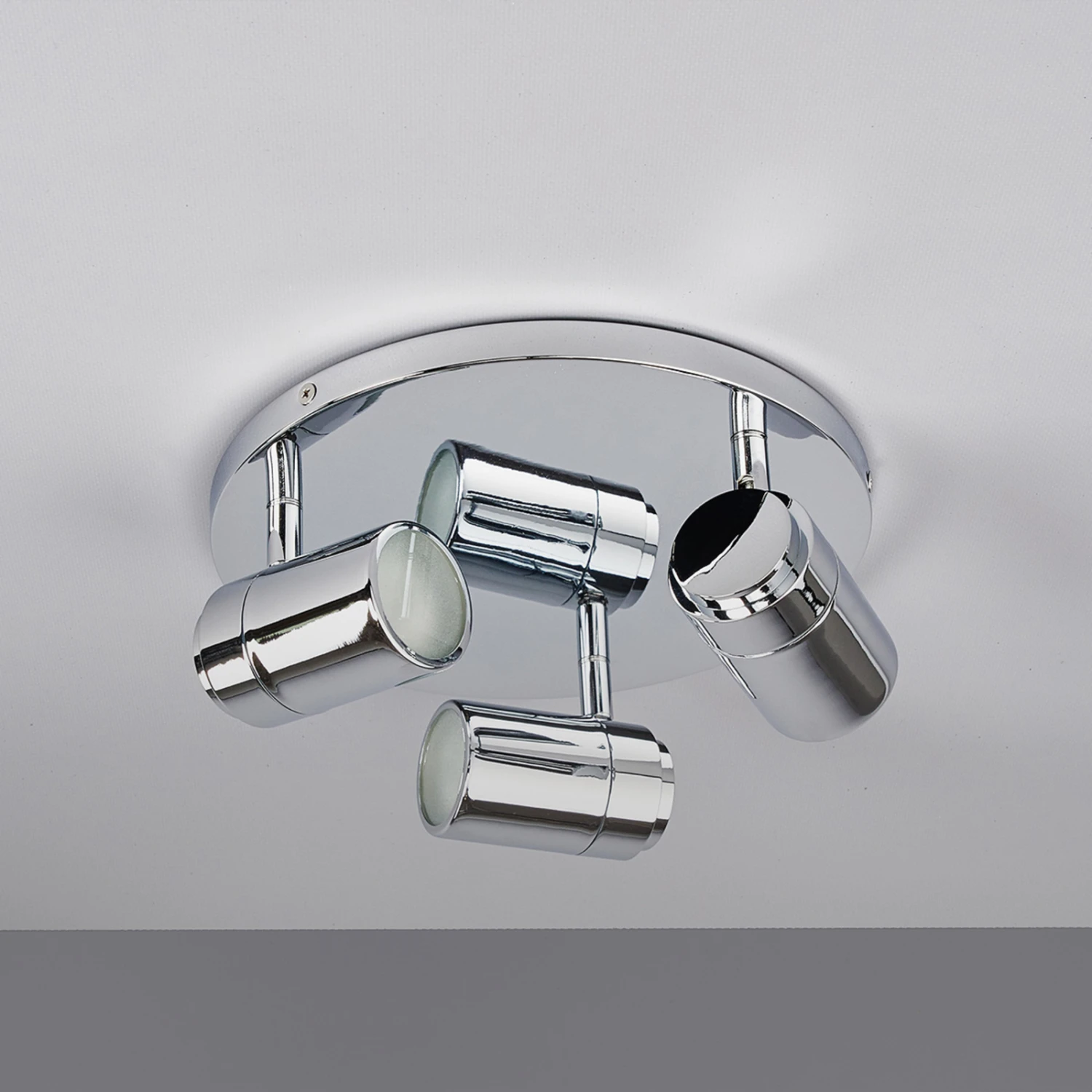 Dieses Deckenrondell Dejan ist zum einen platzsparend, bietet zum anderen aber eine doch recht großflächige Ausleuchtung. Diese Tatsache ist den drei Strahlern geschuldet, die an der runden Deckenbefestigung angebracht sind. Da die Strahler kipp- und drehbar sind, können mit dieser Deckenleuchte drei verschiedene Lichtrichtungen realisiert werden. Das Badezimmer ist von den zahlreichen Räumen, in denen Dejan Verwendung finden kann, nicht ausgenommen. Denn die Schutzart IP44 schützt die Leuchte gut gegen das Eindringen von Spritzwasser. Für Modernität und Zeitlosigkeit steht das chromglänzende Finish der Leuchte. Die GU10-Fassung lässt freie Wahl im Hinblick auf die einzusetzenden Leuchtmittel. So kann man zwischen herkömmlichen Halogenlampen, Energiesparlampen mit GU10-Sockel oder gar LED-Leuchtmitteln wählen.