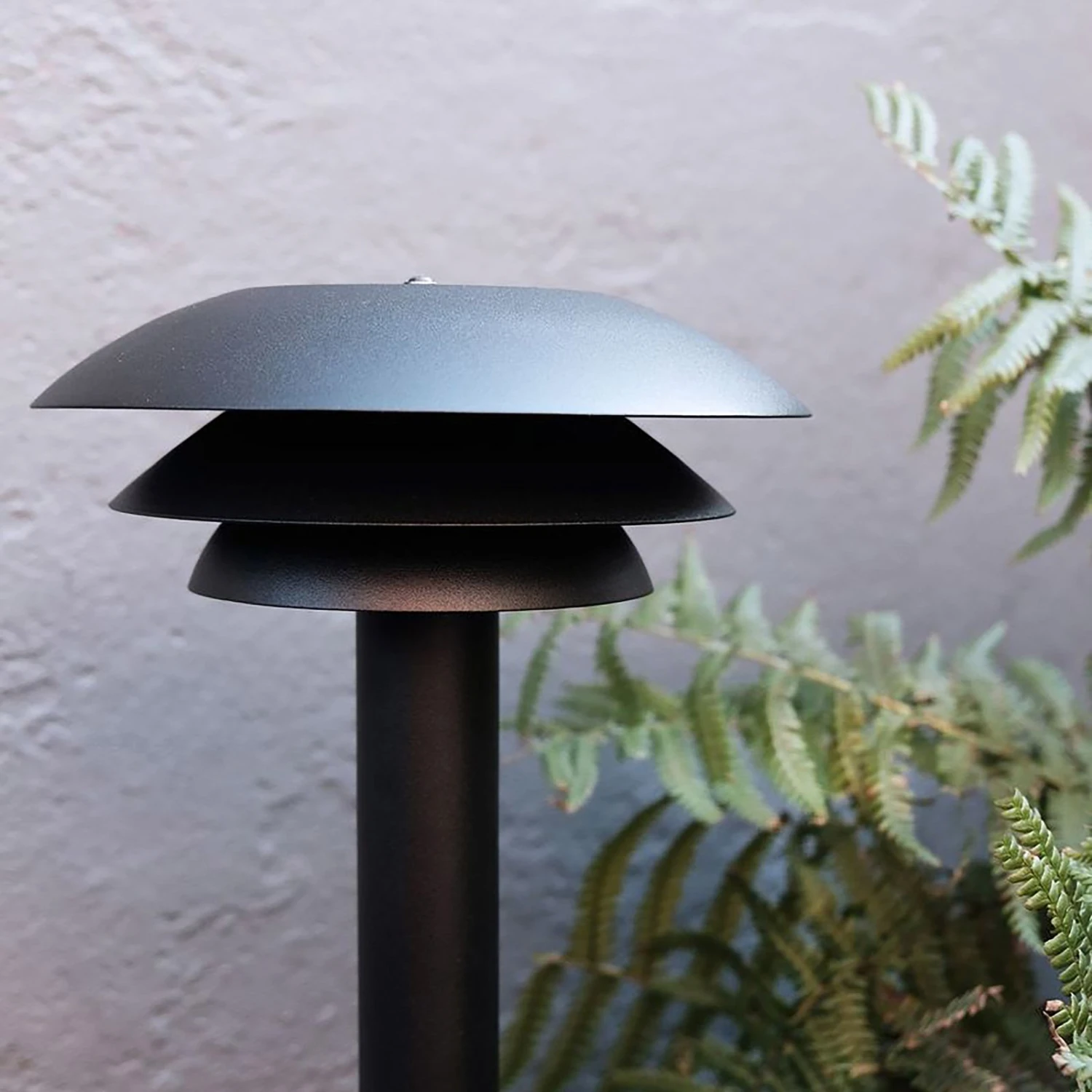 Langlebig und robust und dazu in einer tollen Optik präsentiert sich die Wegeleuchte DL, die aus Edelstahl gefertigt wurde und mit einem matt-schwarzen Finish versehen wurde. Die interessante Gestaltung des Schirmes lässt die Wegeleuchte nicht nur optisch ins Auge stechen, sondern sie bewirkt auch eine blendfreie und interessante Lichtwirkung, denn das Licht des Leuchtmittels inmitten des Schirms wird durch die drei Elemente nach unten gelenkt und beleuchtet sicher die Fläche unterhalb der Leuchte. Wege, Eingänge oder Einfahrten lassen sich mit der Wegeleuchte DL stilvoll und sicher beleuchten.