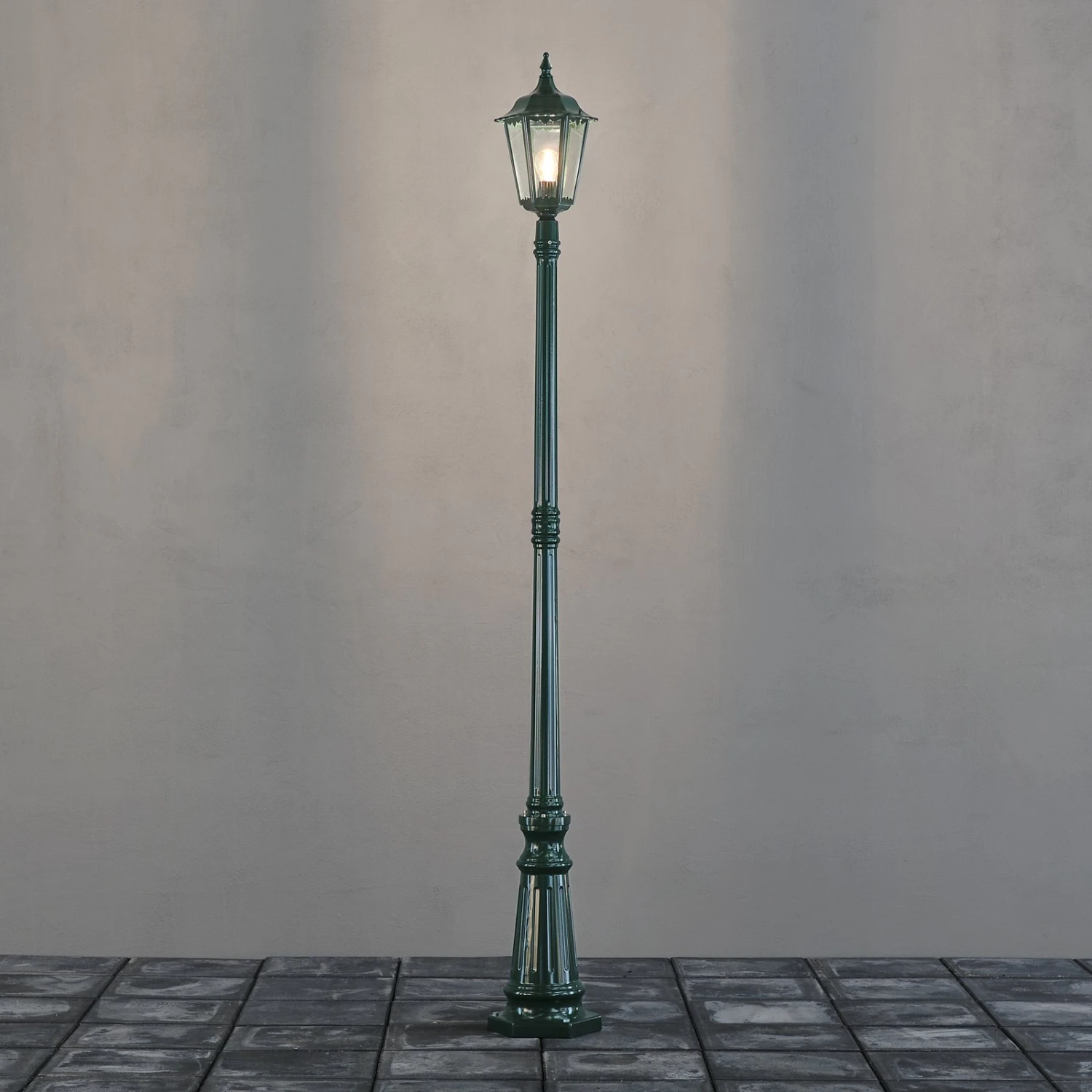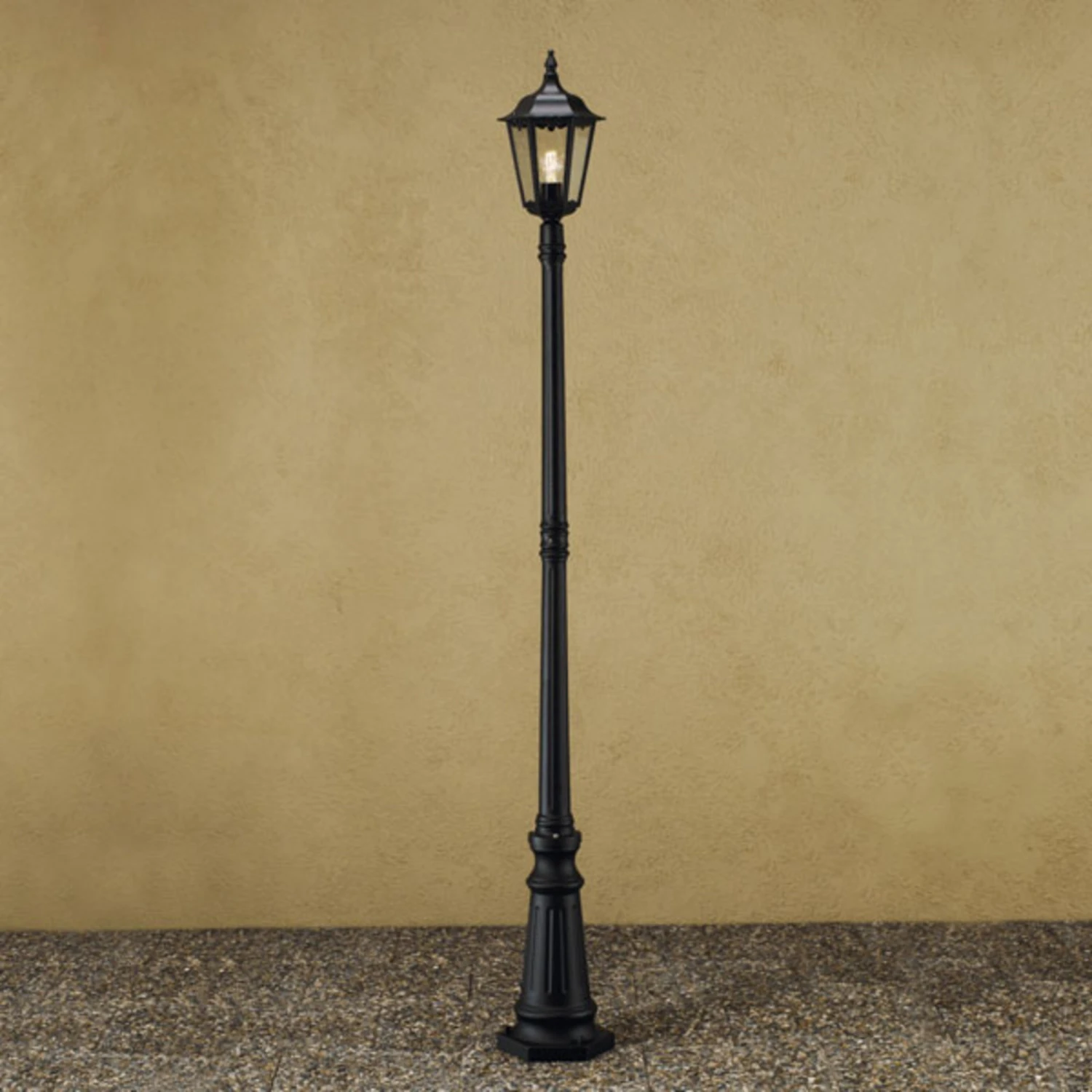 Antik wirkende Mastleuchte Firenze aus Aluminium mit formschöner Laterne auf dem hübsch verzierten Mast. Die Leuchte garantiert eine sehr gute Ausleuchtung.