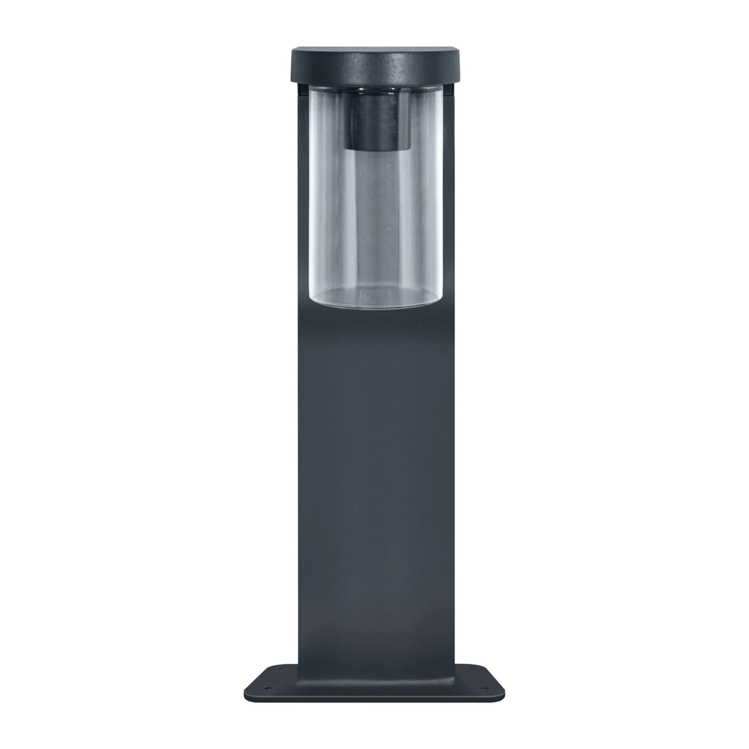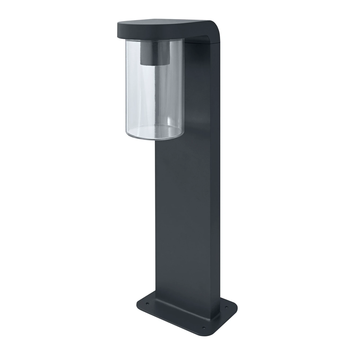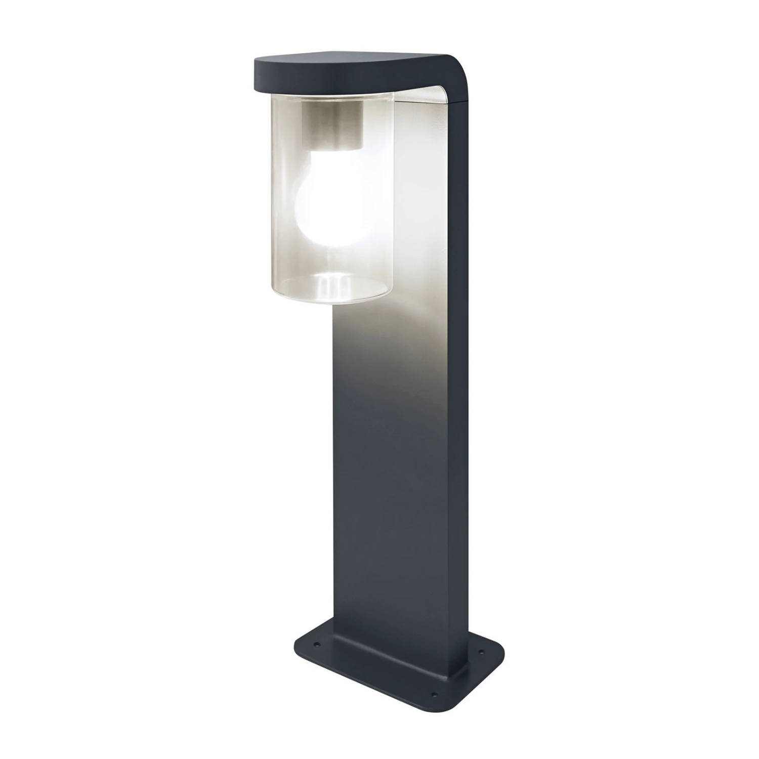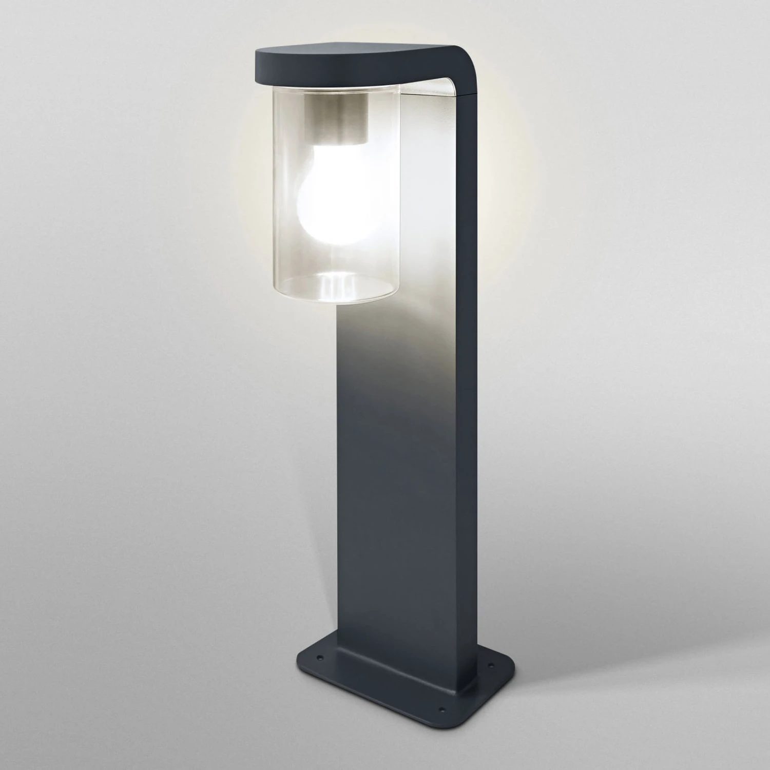 Im oberen Bereich wurde das aus Aluminium mit dunkelgrauem Finish (RAL 7016) gestaltete Gestell der Sockelleuchte Endura Classic Cascade im rechten Winkel nach vorne abgewinkelt. Hier sitzt der zylinderförmige Glasschirm der Sockelleuchte, der frei am Gestell nach unten hängt, so dass das Licht rundum durch das Glas abstrahlen kann. Eine besonders schöne Optik wird erzielt, wenn man in die E27-Fassung eine dekorative Filamentlampe einsetzt. Das Leuchtmittel wird nicht mitgeliefert, Befestigungsmaterial ist im Lieferumfang enthalten.