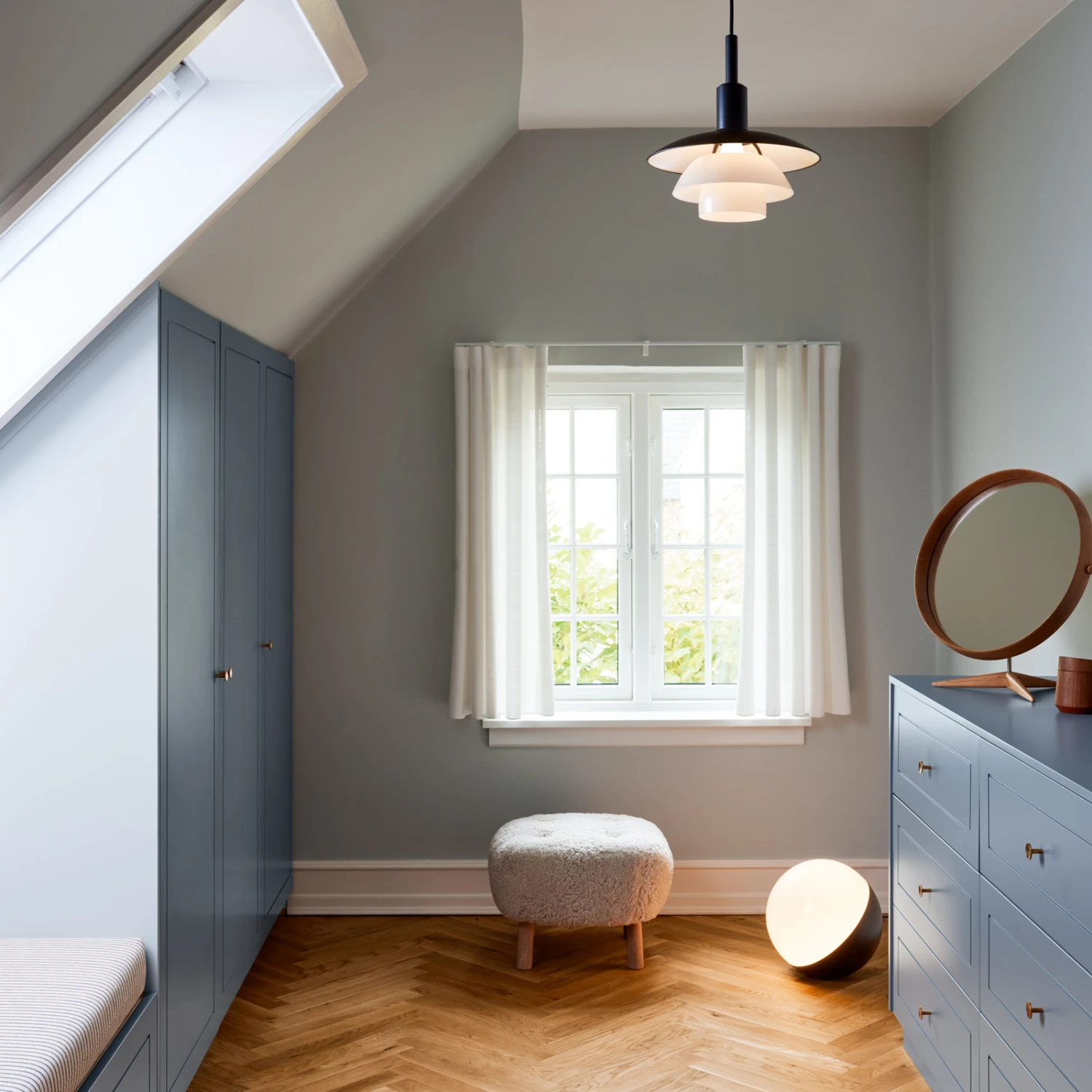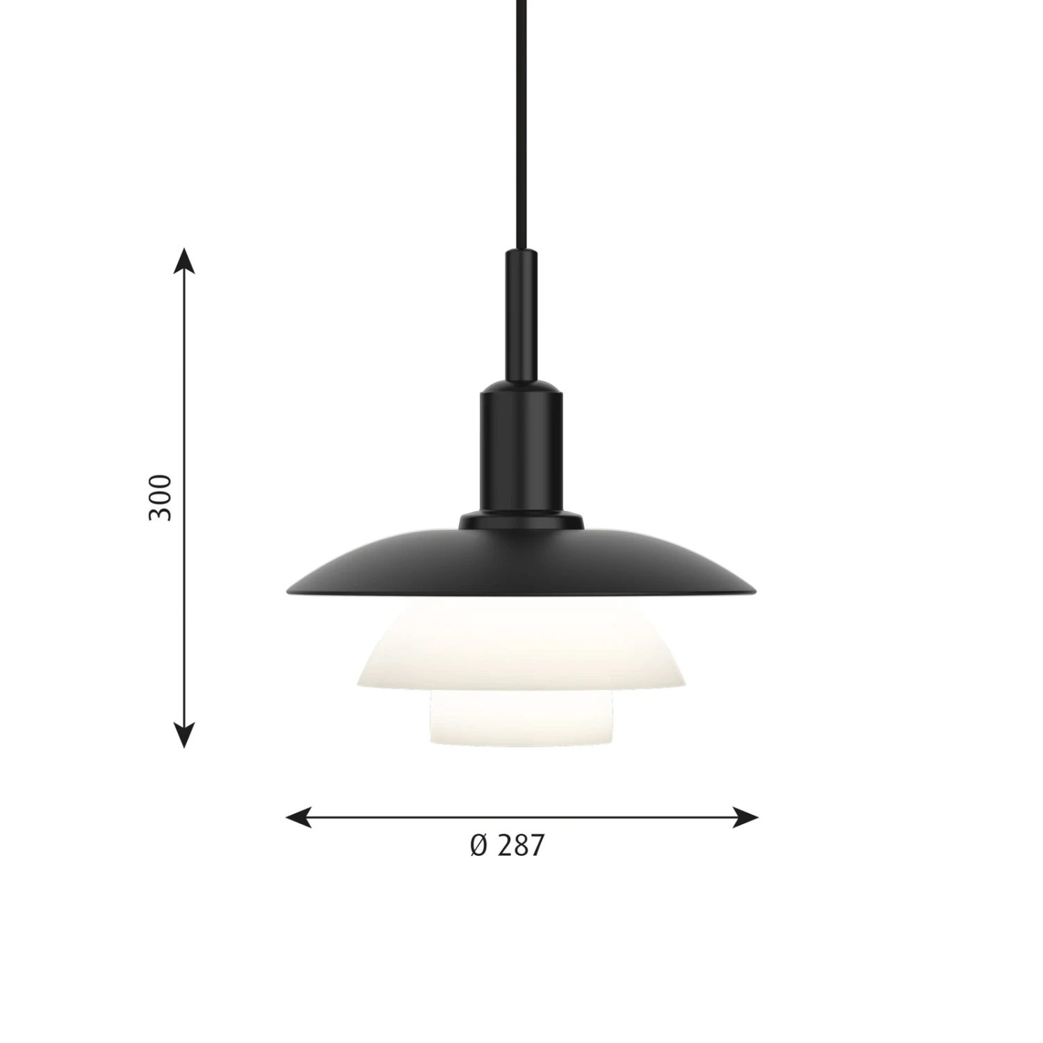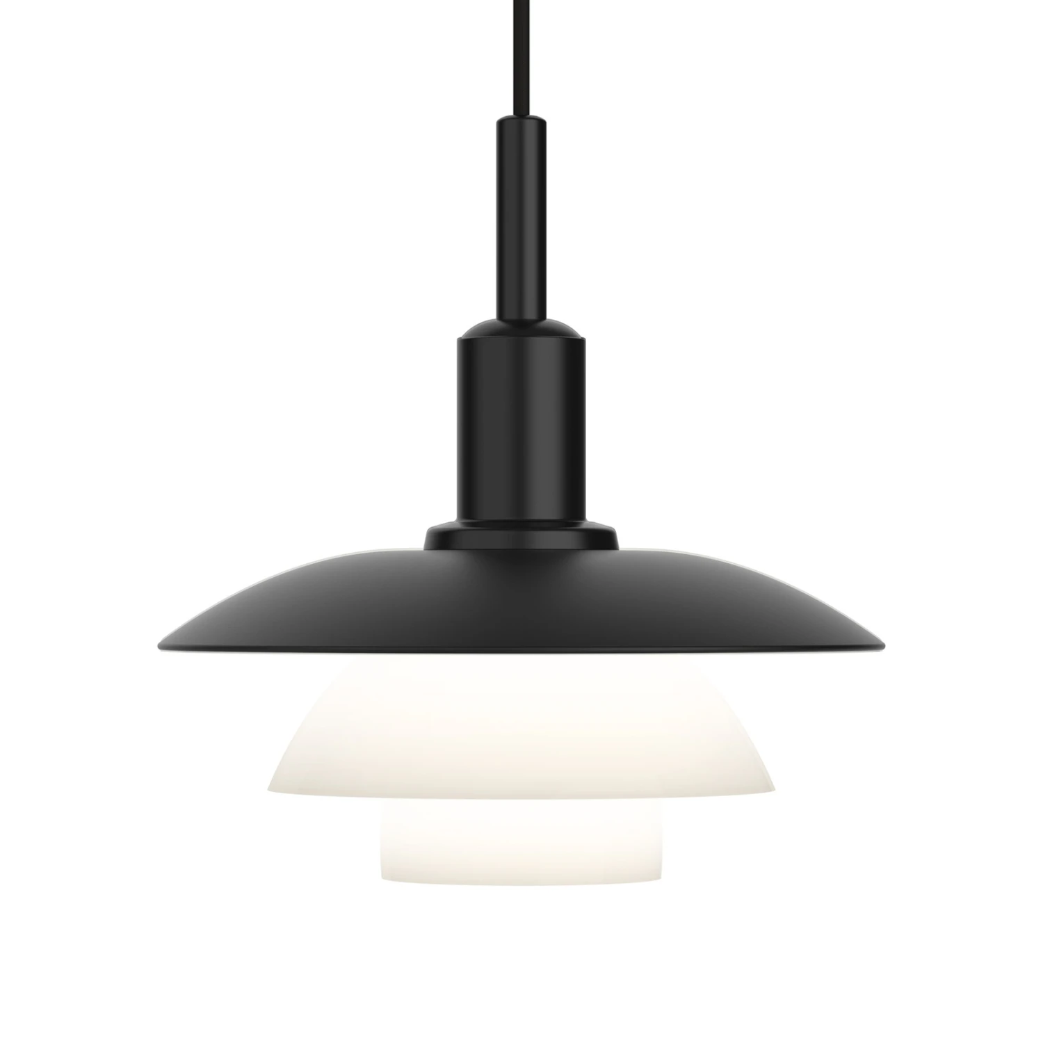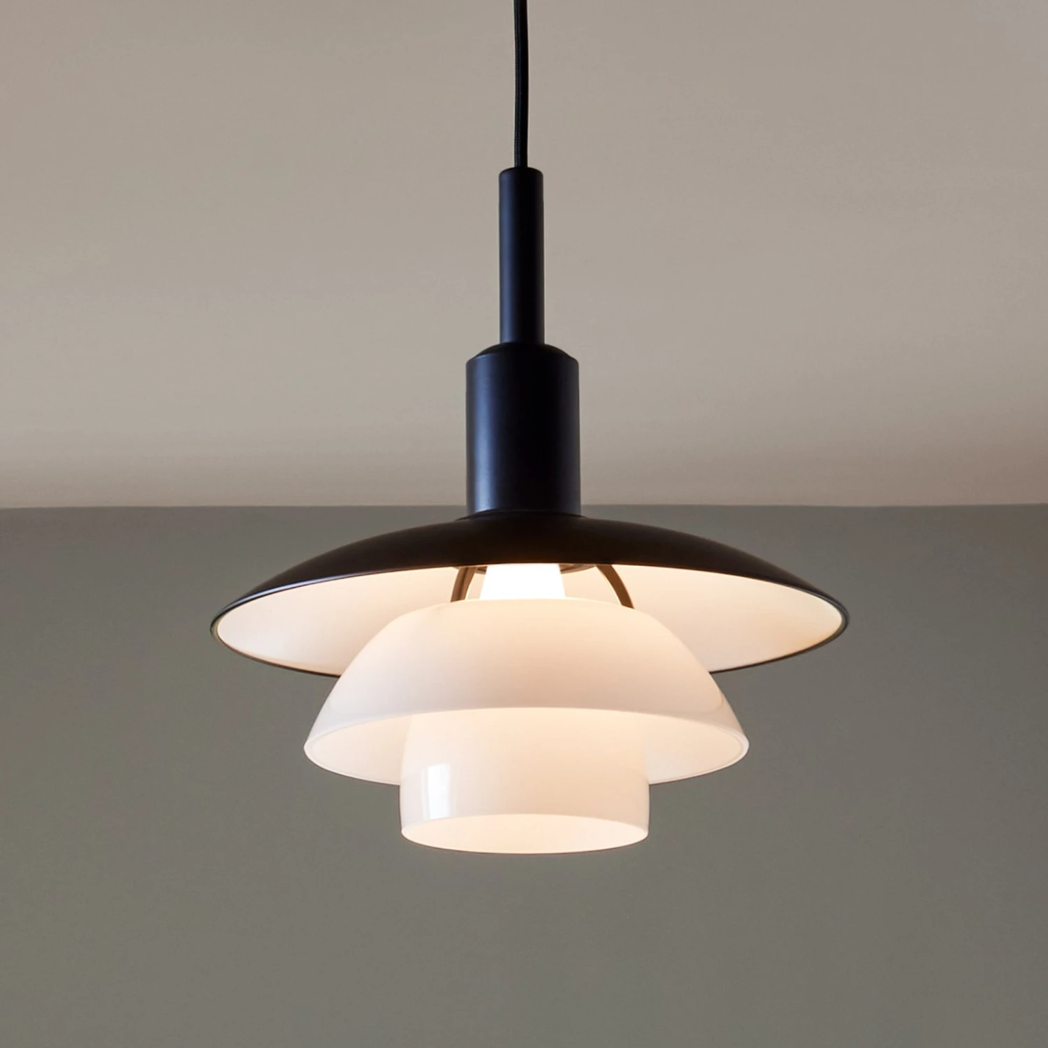 Die Hängeleuchte PH 3/3 fällt durch ihren zweifarbig gestalteten Schirm ins Auge, der zudem aus drei unterschiedlich großen Lagen besteht. Die Abhängung sowie das oberste Element des Schirms sind in Mattschwarz gehalten und bestehen aus Zink-Druckguss und Aluminium. Die beiden unteren Elemente wurden aus Opalglas gefertigt. Der schwarze Schirm strahlt das Licht primär nach unten ab, während die Glasschirme für einen warmen Lichtschein sorgen, der sich um die Leuchte verteilt. PH 3/3 kann beispielsweise als Lichtspender über dem Wohn- oder Esszimmertisch eingesetzt werden.