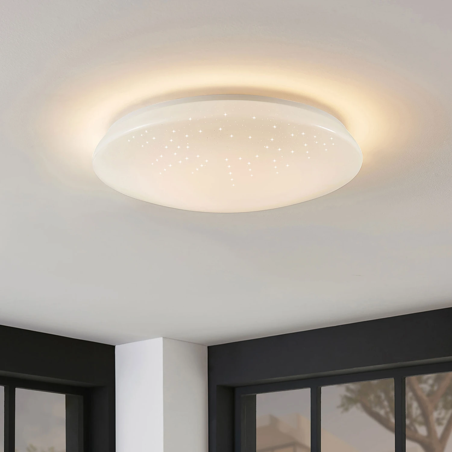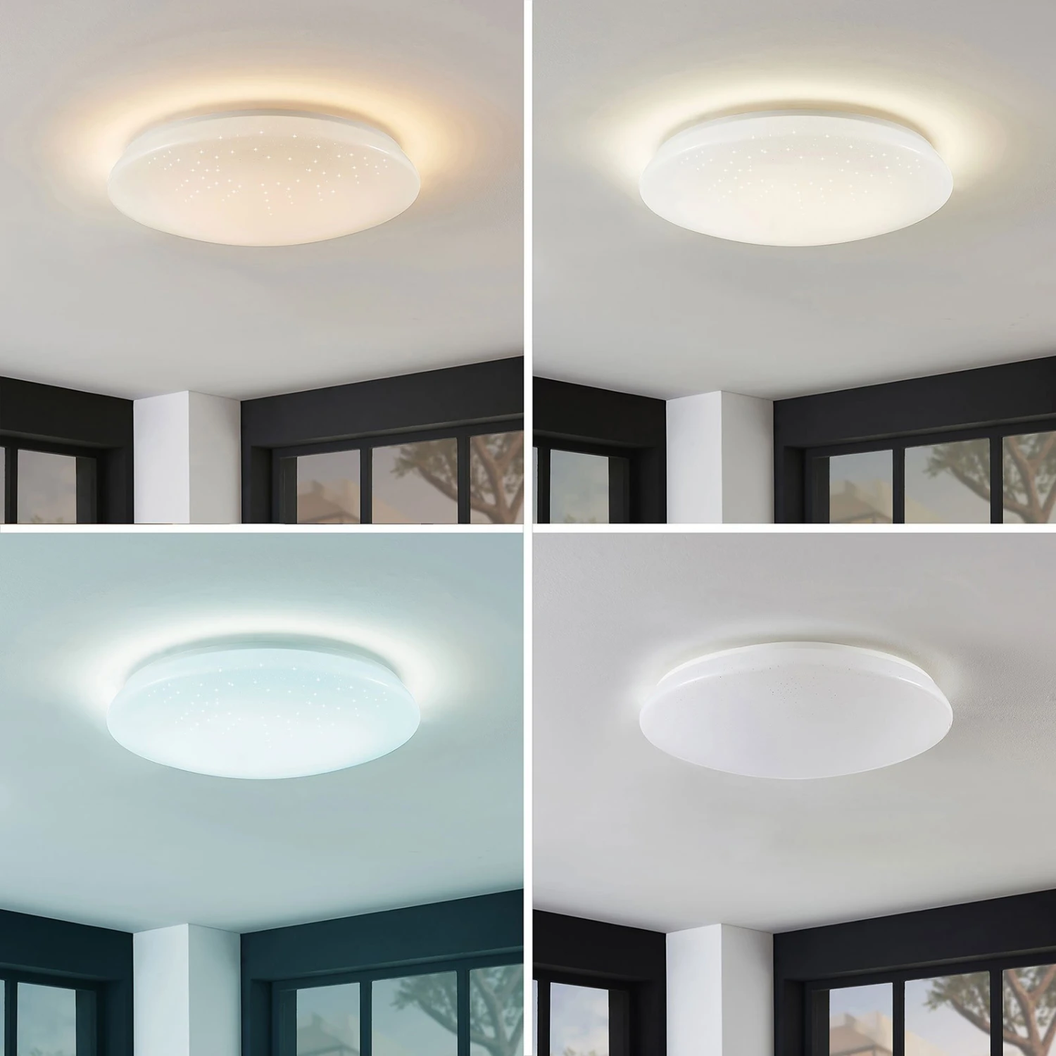Die LED-Deckenleuchte Jelka ist eine runde LED-Deckenleuchte aus weißem Kunststoff, die auf ihrem Schirm unzählige Mikrolochpunkte hat, die für einen eindrucksvollen Funkeleffekt sorgen und den so genannten Starlight-Effekt bewirken. Dabei hat die Leuchte neben diesem sehr ansprechenden Feature jedoch noch viel mehr zu bieten, denn sie ist mit der innovativen WiZ-Technologie ausgestattet, die sich via App (für iOS und Android erhältlich) oder auch mit der beiliegenden Fernbedienung steuern lässt. Damit entsteht eine hohe Funktionalität und man kann nicht nur zwischen verschiedenen Weißtönen auswählen, sondern auch die Farblichtfunktion nutzen, die auf Millionen von Farben zugreift, so dass man sich durchaus auch ein bisschen näher mit der positiven Wirkung von Farben befassen kann, die diese auf Allgemein- und Wohlbefinden haben. So steht Rot zum Beispiel für Vitalität und Energie, Orange und Gelb sind Farbtöne, die aufmuntern und die Stimmung heben, während Grün- und Blautöne beruhigen und harmonisieren, um nur einige Vorzüge zu nennen, die Farblicht zu bieten hat.