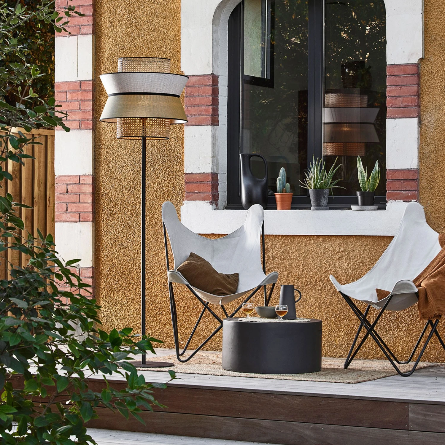 Große Terrassenleuchte Singapour mit Schirm aus Wiener Geflecht und Textil