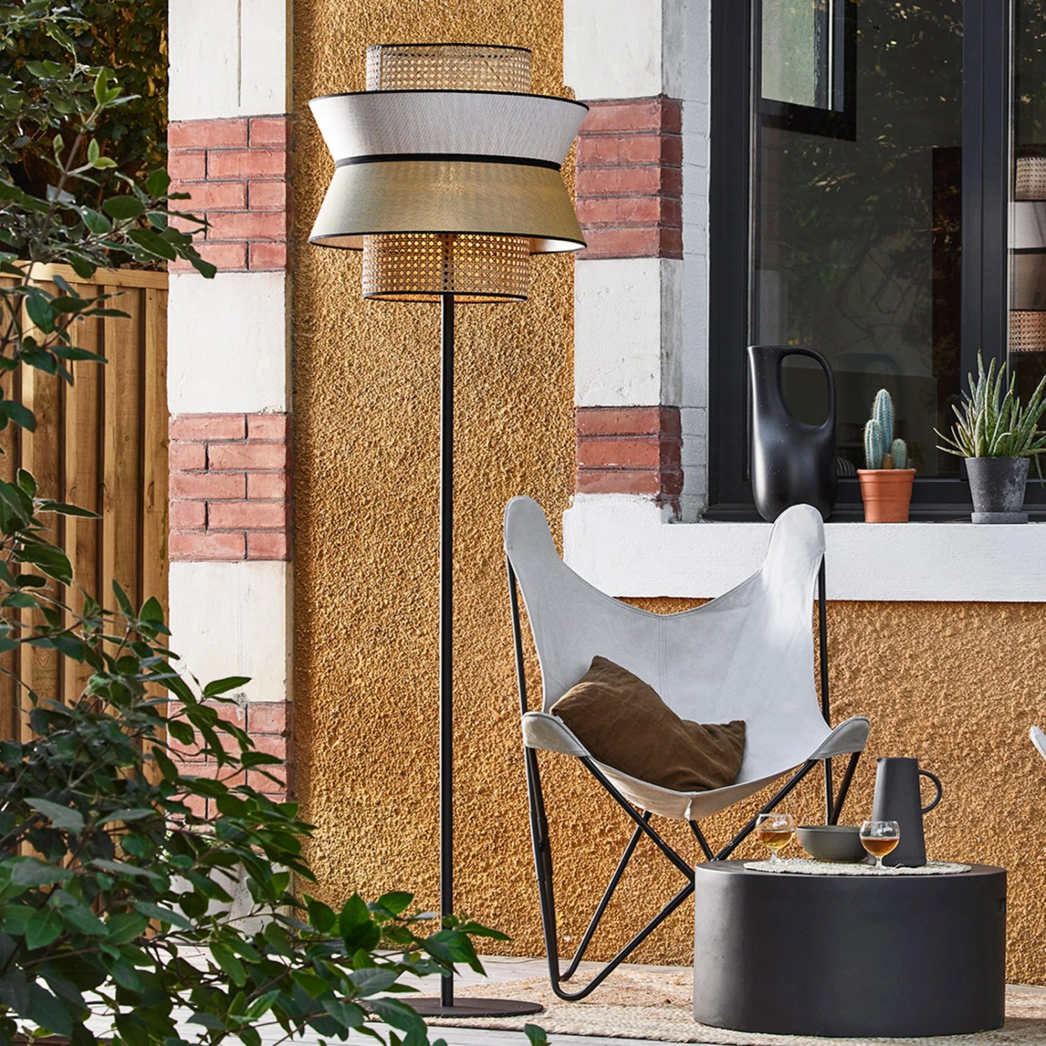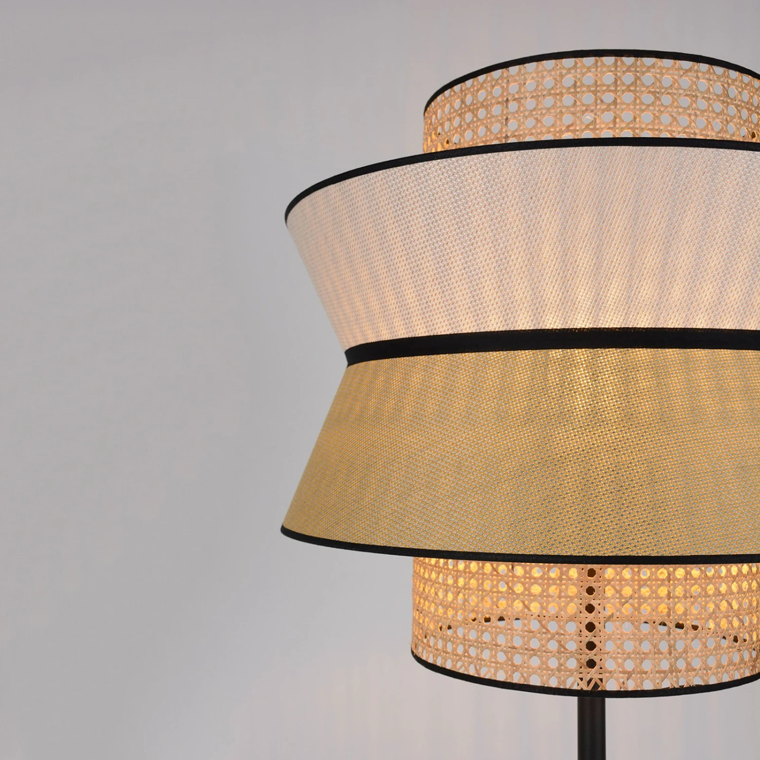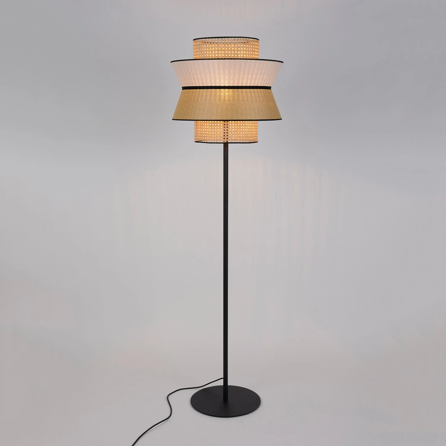 Variabel im Innen- und Außenbereich einsetzbar, ist die Stehleuchte Singapour ein vielseitiger Lichtspender, der mit seiner charakteristischen Kombination von Materialien, Farben und Formen gefällt. Auf dem schlichten Metallgestell in matt-schwarzer Farbe thront ein zweilagiger Schirm. Die Außenschicht aus Textil ist im oberen und unteren Bereich farblich abgesetzt. Die Innensphäre besteht aus natürlichem Rattan, das zu Wiener Geflecht verarbeitet ist. Der Schirm ist dabei in unterschiedlich große Abschnitte in Zylinder- und Kegelstumpfform gegliedert.