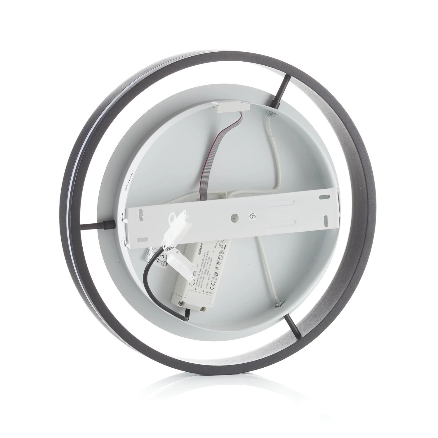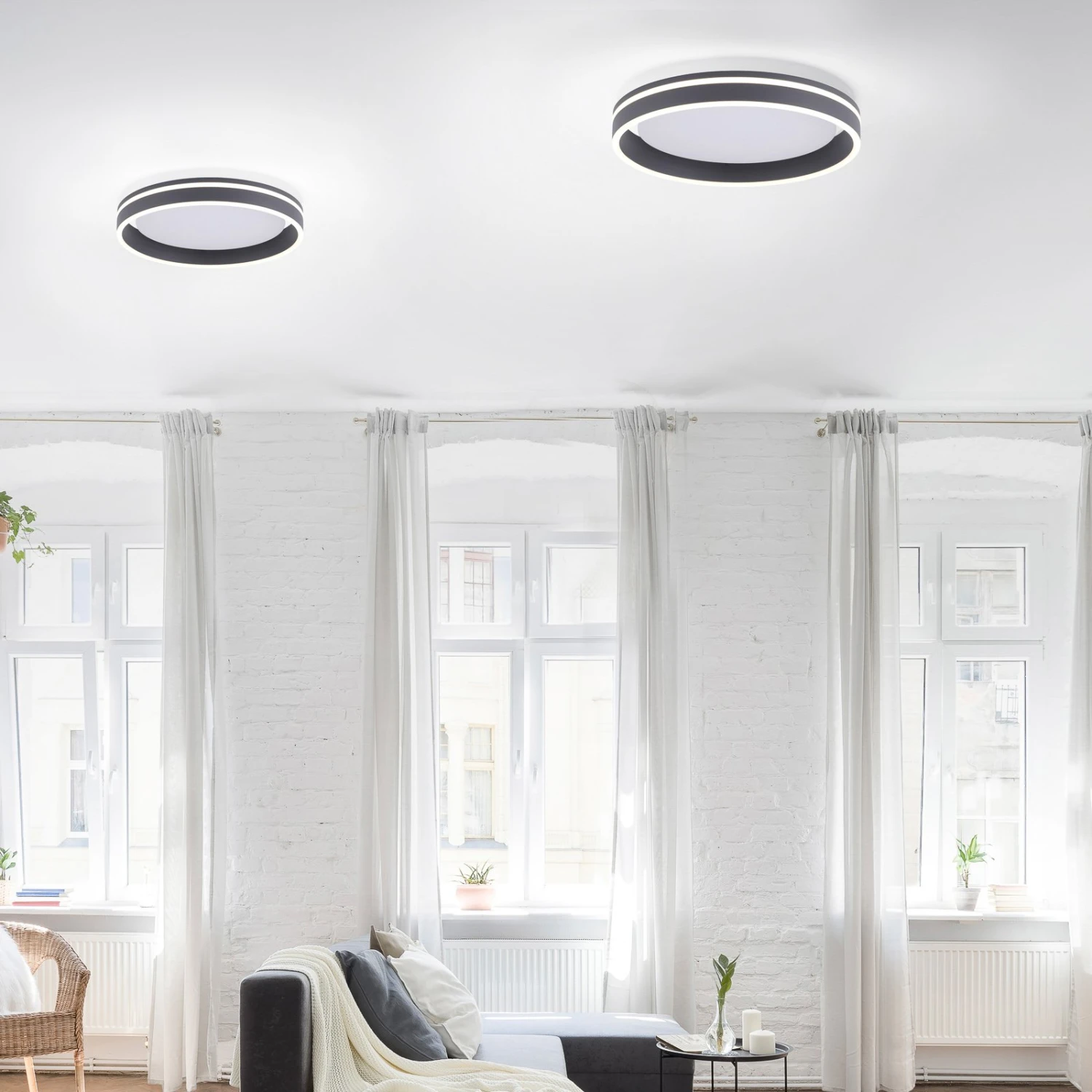 Der kreisförmige Rahmen aus Metall, welcher mit zwei seitlich und nach unten orientierten leuchtenden Ringen ausgestattet ist, verleiht der LED-Deckenleuchte eine moderne Optik. Diese geht Hand in Hand mit nützlichen technischen Features.