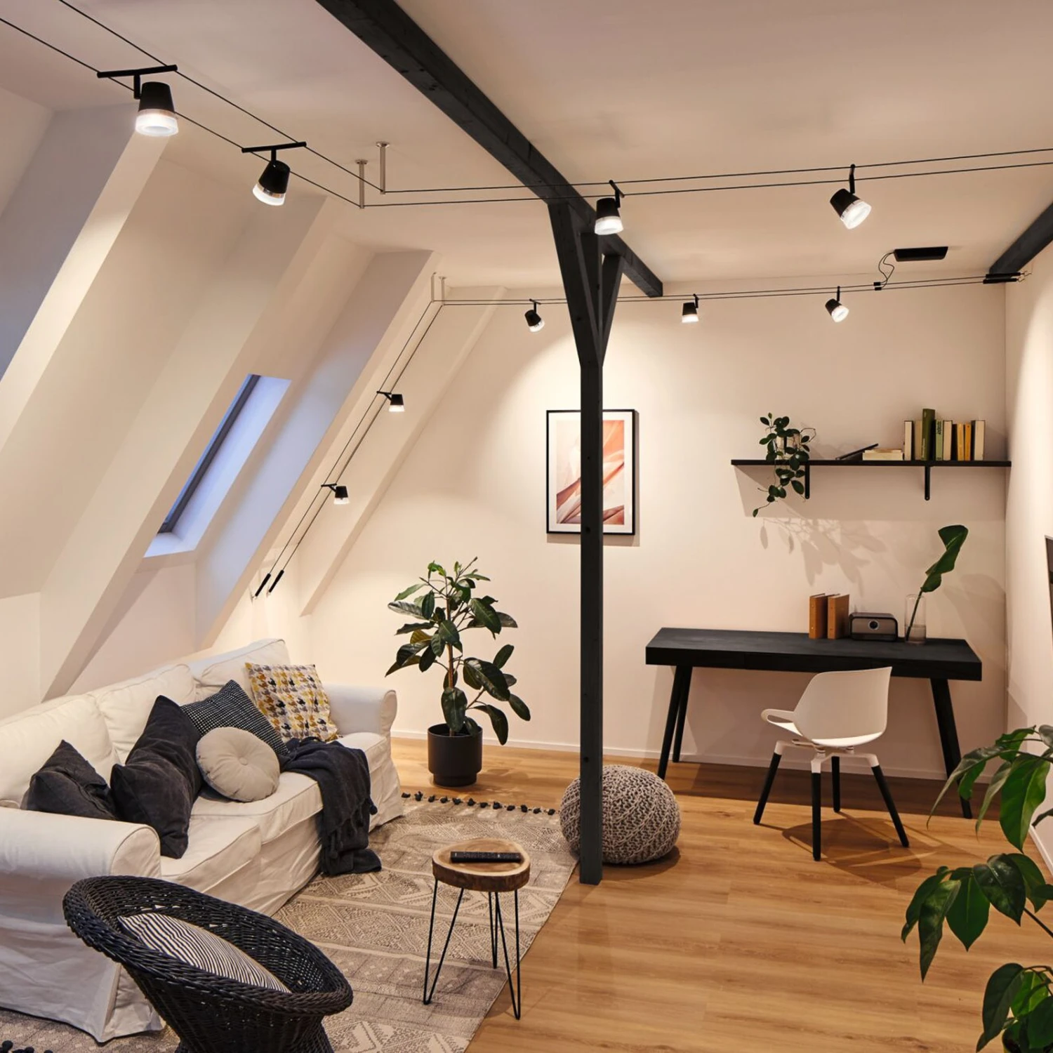 Mit dem Seilsystem Cone LED lässt sich jeder Raum effektiv und vor allem flexibel beleuchten. Ob gerade angebracht, an der Deckenschräge oder verwinkelt montiert – Seilsysteme bieten grenzenlose Gestaltungsmöglichkeiten und passen in jeden Raum. Das System besteht aus dem Seil, einem Trafo und fünf Leuchten, die sich beliebig am Seil anordnen lassen. Sie sind in leicht konisch zulaufender Form gestaltet und mit einem glänzenden Zierring sowie einem satinierten Ring an der Öffnung gearbeitet und lassen sich schwenken und drehen, so dass ihr Licht bis in jede Ecke eines Raumes reicht und sich verschiedene Raumbereiche oder Einrichtungsgegenstände gezielt beleuchten lassen.