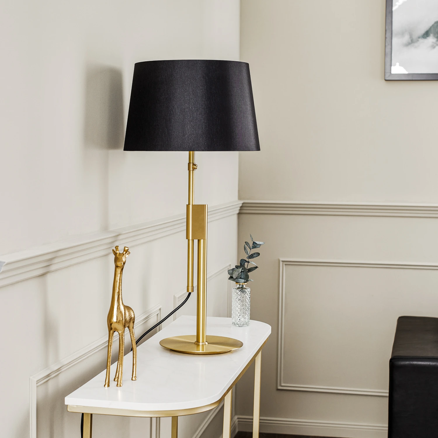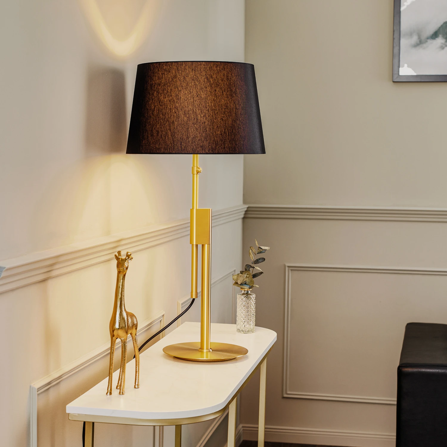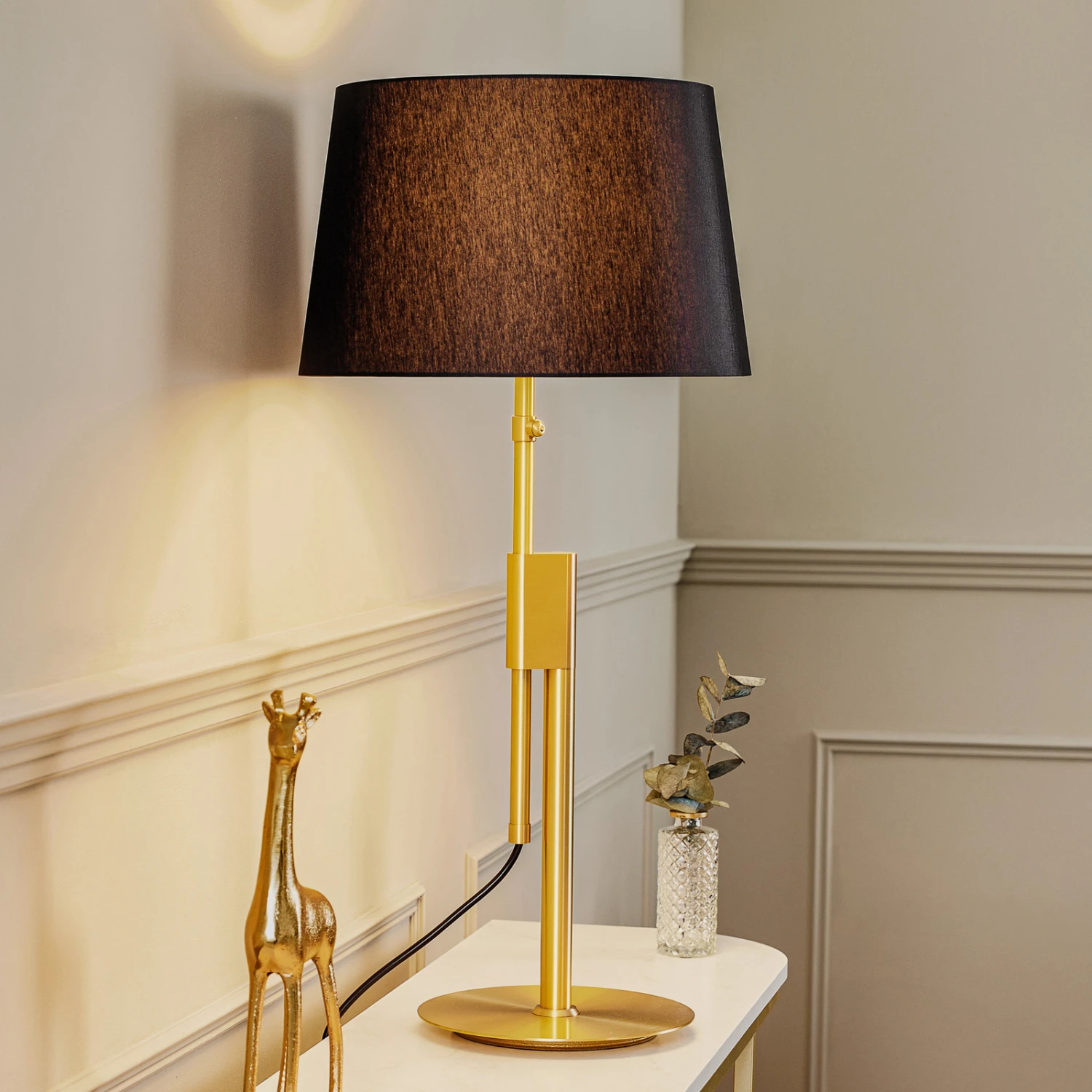Edle Stoff-Tischlampe Lemalian mit Messinggestell und Textilschirm, dimbar, hergestellt in Deutschland