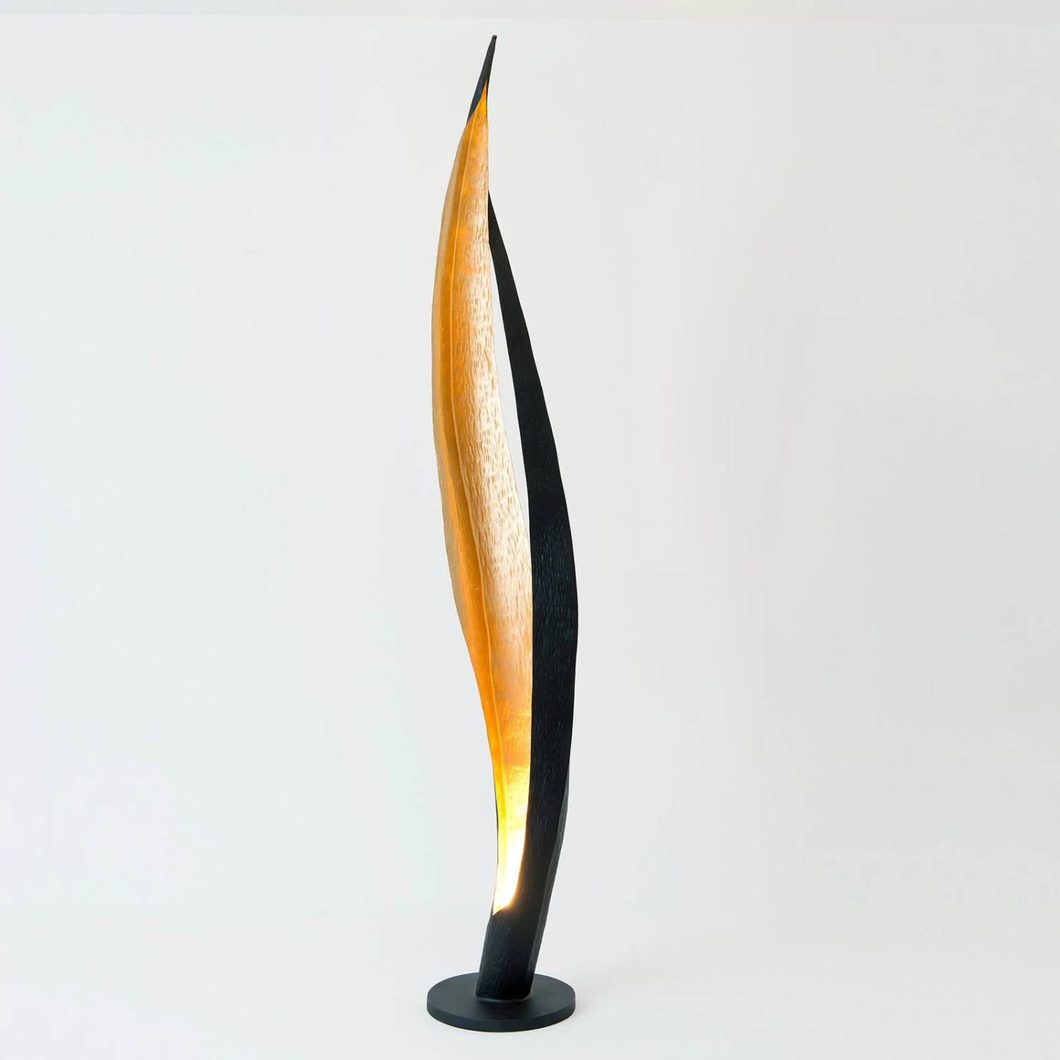Ein besonderes Leuchtenaccessoire, das zum einen für eine effektvolle, atmosphärische Zusatzbeleuchtung im Wohnzimmer sorgt, und zum anderen auch unbeleuchtet als dekorativer Blickfang dient, stellt die Stehleuchte Barbone dar. Vom schlichten Fuß aus erstrecken sich – in der Form exotischen Blättern ähnlich – zwei Elemente nach oben in den Raum, die von außen schwarz-braun und von innen goldfarben gehämmert sind. Direkt über der Bodenplatte ist mittig eine GU10-Fassung verbaut, die mit einer passenden Lampe nach Wahl bestückt werden kann (siehe Zubehör). Das Licht der eingesetzten Lampe bringt die Schönheit von Barbone dann voll zur Geltung, in Kombination mit dem Goldton wird eine glanzvolle, behagliche Lichtstimmung erzeugt.